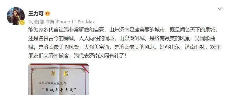 在受聘成為“泉城形象大使”之后,王力可也在個(gè)人社交媒體上與廣大粉絲分享了這一喜悅。王力可表示,“能為家鄉(xiāng)代言讓我非常驕傲和自豪,山東濟(jì)南是座美麗的城市,既是聞名天下的泉城,還是名貫古今的舜城、人人向往的詞城。山泉湖河城,是濟(jì)南最美的風(fēng)景,詩(shī)詞歌曲賦,是濟(jì)南最美的風(fēng)骨,大強(qiáng)美富通,是濟(jì)南最美的風(fēng)范。好客山東,濟(jì)南有禮,歡迎朋友們來濟(jì)南做客,我代表濟(jì)南這廂有禮了!”
