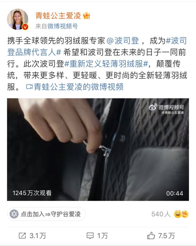 9月20日,波司登官宣谷愛凌(明星代言公司)成為品牌代言人,并且順勢(shì)推出輕薄羽絨服。