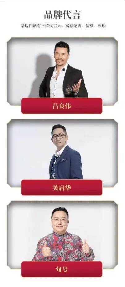 近日,云倉酒莊旗下品牌豪邁白酒簽約中國香港男演員呂良偉(明星代言公司)為品牌代言人,至此,豪邁白酒共有三位明星代言人,分別是豪爽大氣的呂良偉、儒雅風(fēng)范的吳啟華(明星代言公司)、歡樂隨和的句號(明星代言公司),這也代表了豪邁白酒的理念:豪爽、儒雅、歡樂。