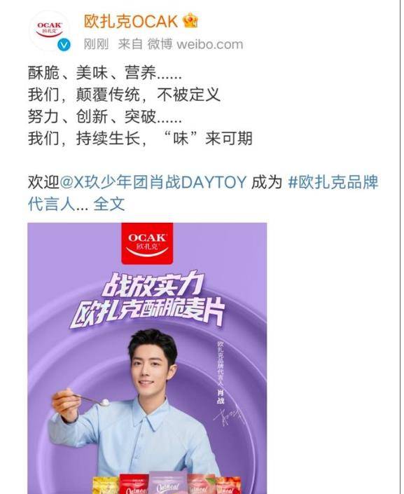 《歐扎克》品牌方在約定好的時(shí)間(10:05)正式更博官宣肖戰(zhàn)為品牌代言人,儀式感滿滿。歐扎克和肖戰(zhàn)一起,戰(zhàn)放實(shí)力,“味”來可期!