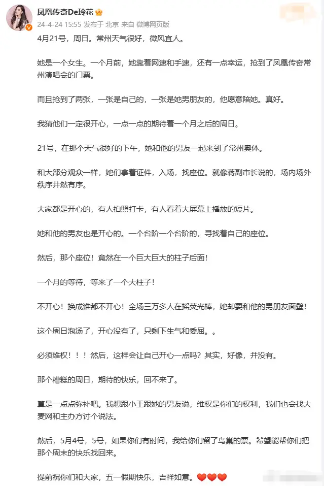 4月24日,鳳凰傳奇玲花發(fā)長文回應(yīng)歌迷在常州演唱會上買到柱子票一事,表示支持粉絲維權(quán)。她寫道“一個月的等待,等來了一個大柱子!換成誰都不開心!必須維權(quán)!”最后,玲花為了彌補歌迷,還幫忙預(yù)留了北京鳥巢演唱會的門票,表示“希望能幫你們把那個周末的快樂找回來”。