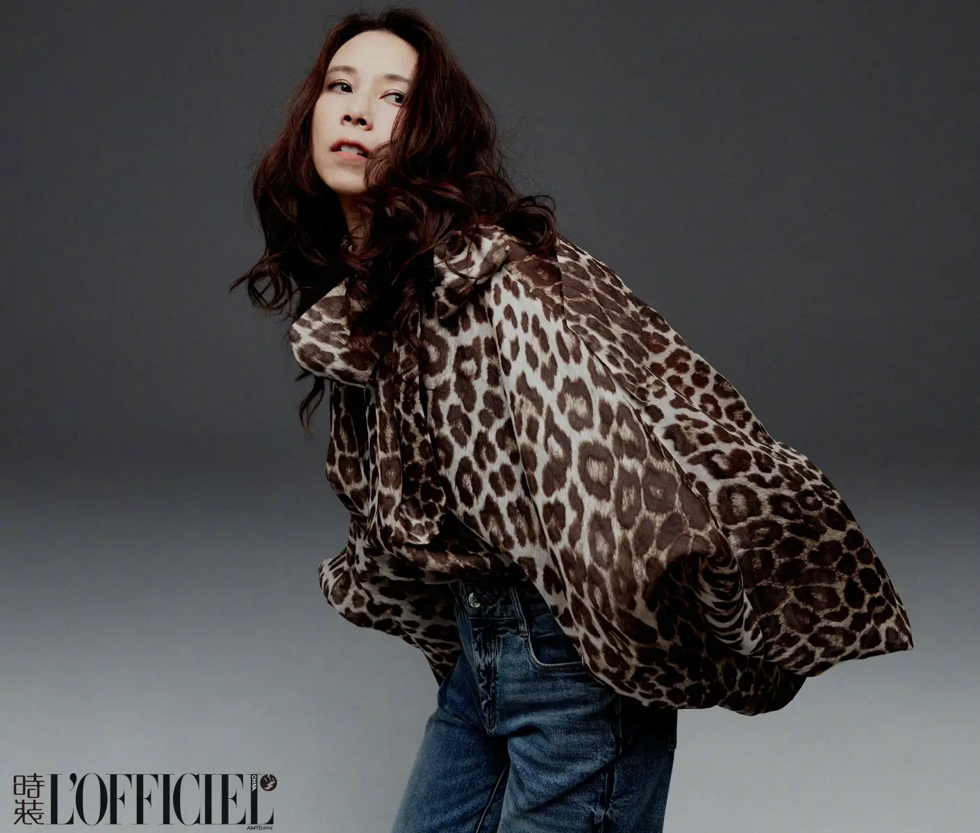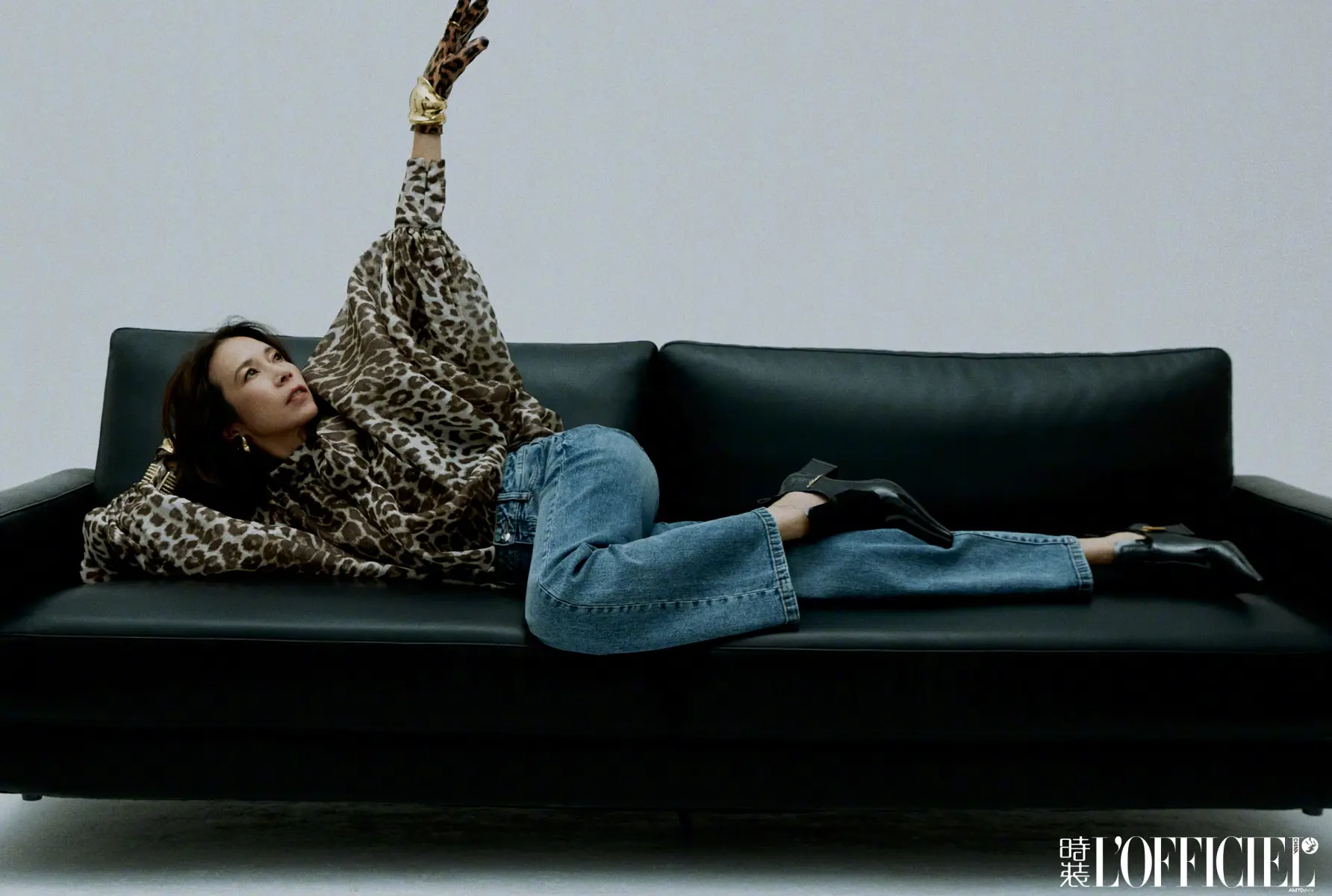 莫文蔚穿豹紋上衣搭配牛仔褲,躺在沙發(fā)上,非常愜意。