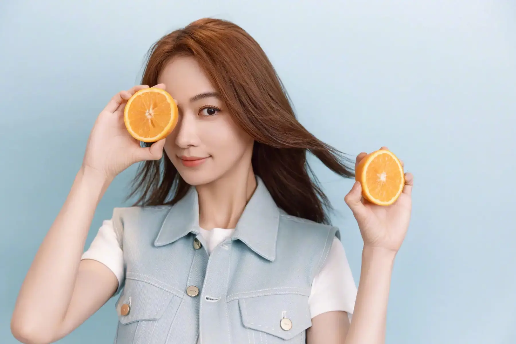 吳謹(jǐn)言身穿藍(lán)色馬甲清新可人 手拿橙子俏皮甜美