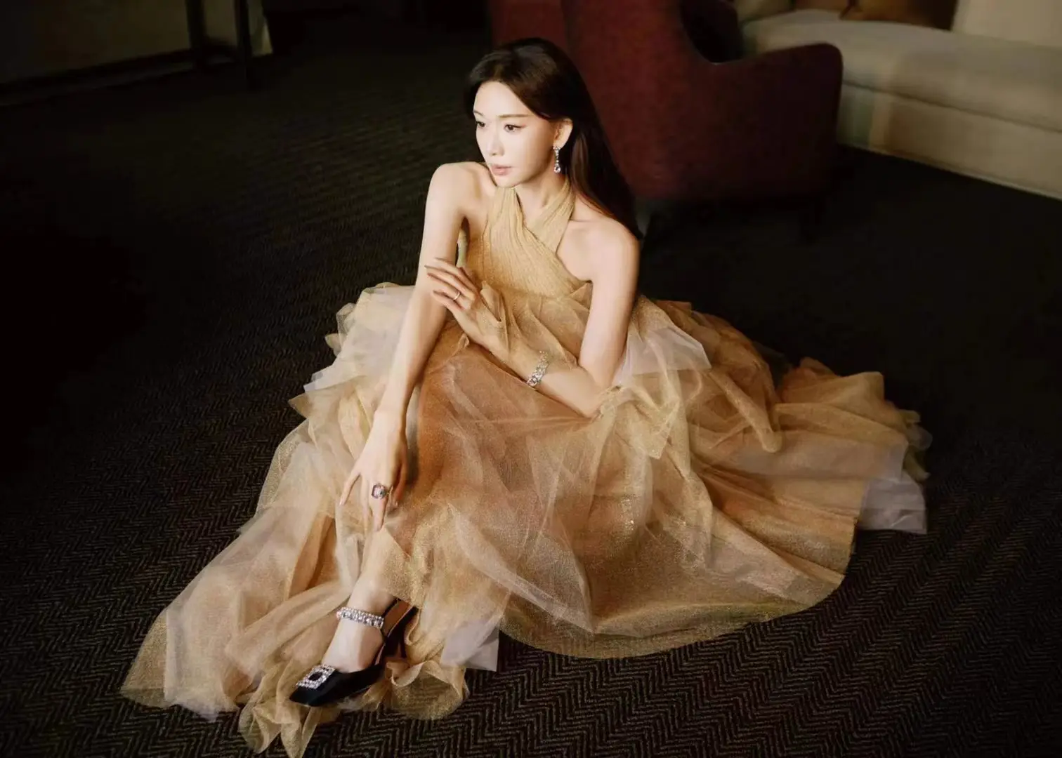 文詠珊穿鎏金露背裙光彩照人 性感坐姿勾勒好身材