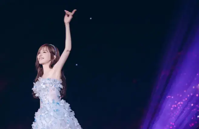 4月17日,王心凌天津演唱會,穿藍色抹胸禮裙,燈光打在禮裙上,波光粼粼如夢如幻,她一頭栗色長發(fā)微卷側分在一旁,恬靜溫潤如若仙女下凡。