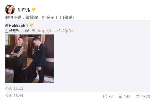 6月24日,胡杏兒老公李乘德在微博曬為老婆提裙擺的照片,并配文寫(xiě)道:“皇后駕到……喳!”照片中,胡杏兒身穿黑色禮服,雙手抱在胸前,一副傲慢的表情,長(zhǎng)長(zhǎng)的裙擺一直拖到地上,胡杏兒老公李乘德低頭為其提起來(lái),猶如奴仆與主人的樣子。