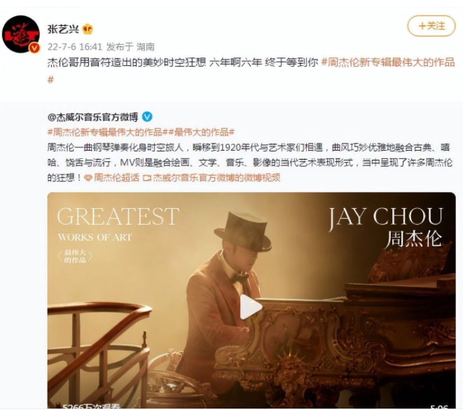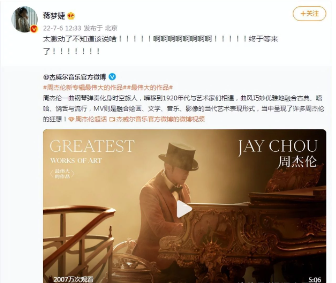 2022年7月6日中午12點,周杰倫新專輯《最偉大的作品》同名歌曲MV公開,很多明星發(fā)微博為其打call,我們來看看都有誰。