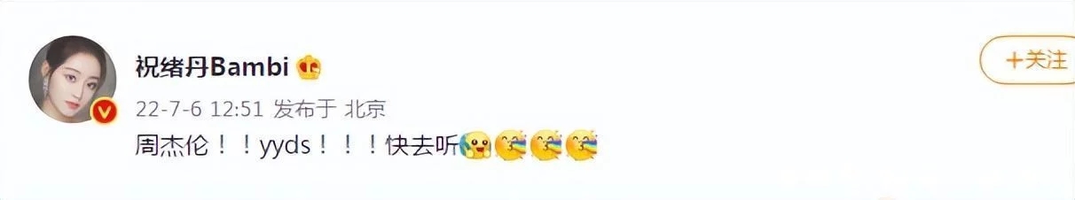 蔣夢婕說:“太激動了,不知道該說啥,啊啊啊,終于等來了。”祝緒丹則說:“周杰倫,YYDS,快去聽。”