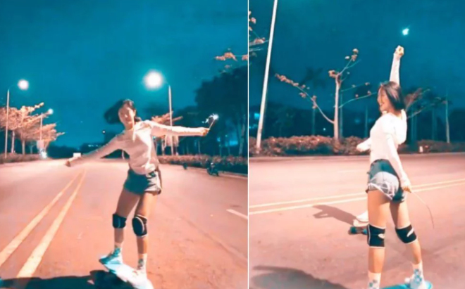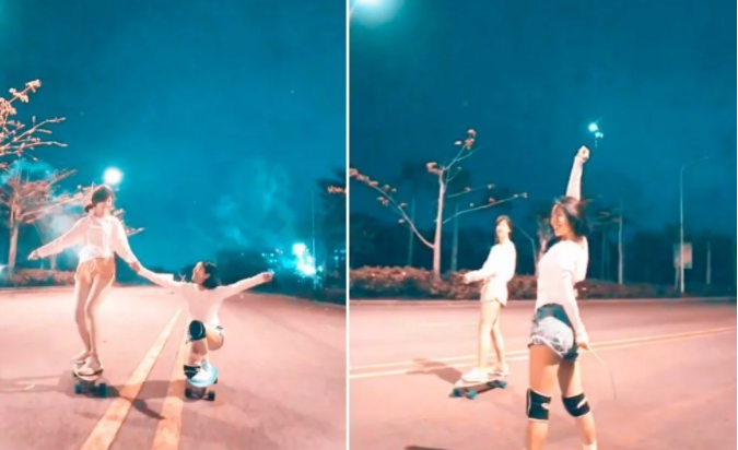 值得一提的是,趙奕歡并不是一個人去滑板,畢竟一個女孩子深夜在路上滑板,或多或少要注意一下安全問題。視頻中趙奕歡和她的妹妹在一起,兩個人關(guān)系相當(dāng)親密,趙奕歡蹲在滑板上牽著她妹妹的手,姐妹兩個身材都相當(dāng)吸睛,一雙大長腿又細又直。