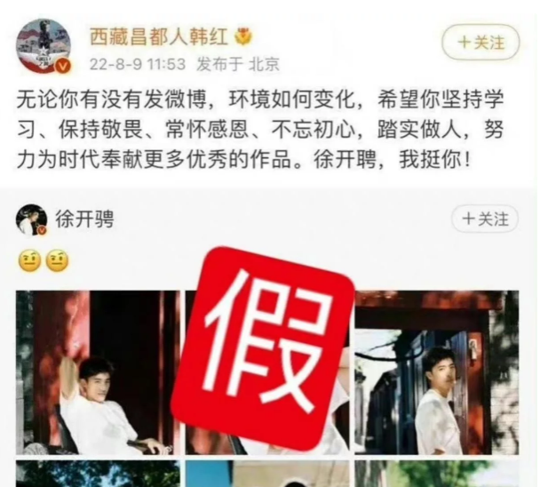 當(dāng)天,一則“韓紅力挺徐開騁”的截圖更是在網(wǎng)絡(luò)上廣為流傳,截圖顯示韓紅(明星經(jīng)紀(jì)公司)在8月9日發(fā)布微博,回復(fù)了徐開騁“無論你有沒有發(fā)微博,環(huán)境如何變化,希望你堅持學(xué)習(xí)、保持敬畏、常懷感恩、不忘初心,踏實做人,努力為時代奉獻(xiàn)更多優(yōu)秀的作品。徐開聘,我挺你!”