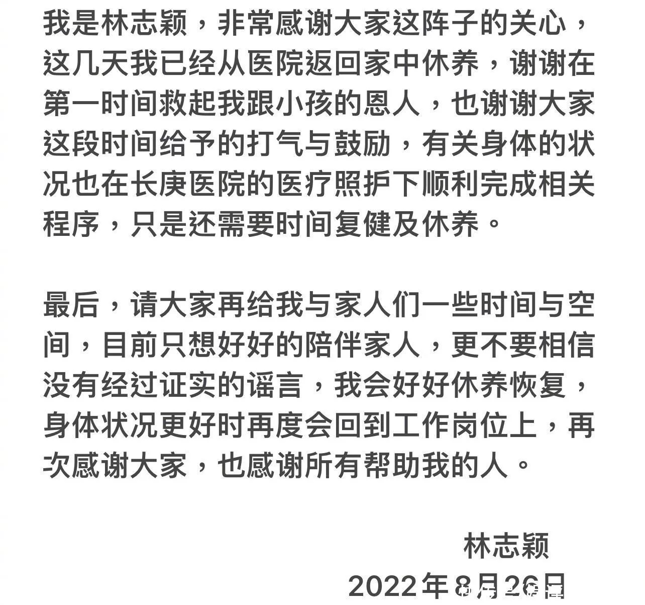 2022年8月26日,林志穎(明星經(jīng)紀(jì)公司)遭遇嚴(yán)重車禍后,首次發(fā)微博報(bào)平安,透露自己已經(jīng)從醫(yī)院返回家中休養(yǎng),身體狀況也在醫(yī)院照護(hù)下順利完成相關(guān)程序。