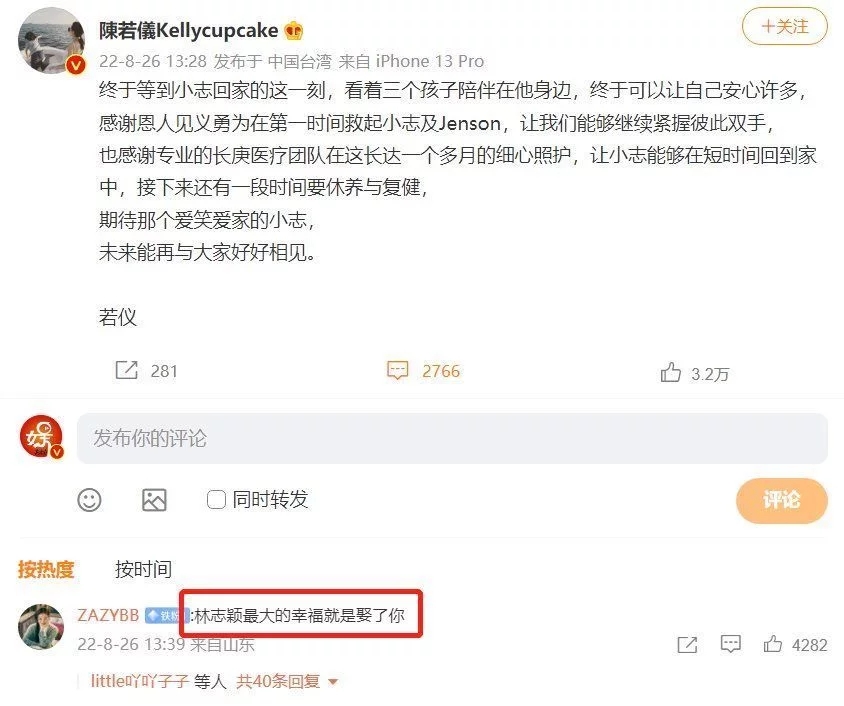 隨后,林志穎的妻子陳若儀也在微博發(fā)文:“終于等到小志回家的這一刻,看著三個(gè)孩子陪伴在他身邊,終于可以讓自己安心許多。期待那個(gè)愛笑愛家的小志,未來能再與大家好好相見。”粉絲留言對(duì)陳若儀說:“林志穎最大的幸福就是娶了你。”