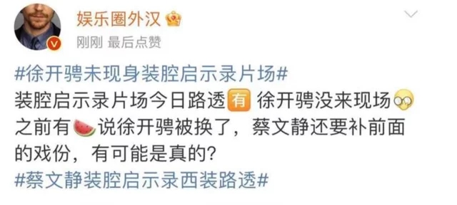 緊接著,又有多個(gè)爆料賬號(hào)稱徐開(kāi)騁已經(jīng)被《裝腔》劇組開(kāi)除,換了新人接手,搭檔蔡文靜需要補(bǔ)拍前面已經(jīng)拍完的雙人戲份,大概需要15天。