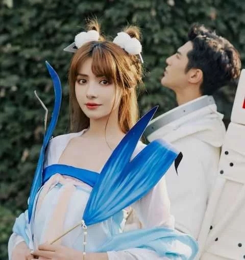 只見麥迪娜頭上分出幾股秀發(fā),在頭頂出扎成小揪揪,再用毛絨絨的白色發(fā)圈固定。剩余的頭發(fā)披散在身后,在陽光下泛著金黃的光澤。身上穿著藍(lán)白色的漢服,手上還拿著裝飾扇子。整體造型溫婉賢淑,再配上麥迪娜超高的顏值,這不就是夢中嫦娥的模樣嗎?
