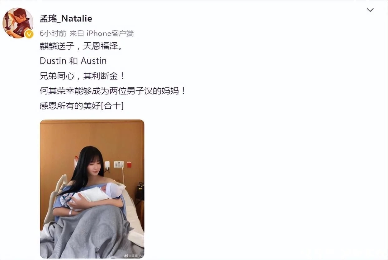 9月15日,39歲的“晶女郎”孟瑤(明星經(jīng)紀(jì)公司)在社交平臺上曬照官宣產(chǎn)子,這是她的第二個孩子,也就是和現(xiàn)任男友的第一個孩子,此前她就有一個大兒子名叫Dustin,二兒子她起名為Austin,她也是配文稱:“麒麟送子,天恩福澤。Dustin 和 Austin 兄弟同心,其利斷金!何其榮幸能夠成為兩位男子漢的媽媽!感恩所有的美好”可見她對于孩子的到來是感受到滿滿的幸福。