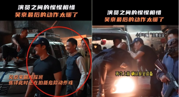 此次探班除了有觀看已拍攝片段以及和制片導(dǎo)演交流以外,吳京還去看了好兄弟張譯的片場(chǎng),當(dāng)時(shí)正逢張譯在拍攝危險(xiǎn)動(dòng)作戲,吳京為環(huán)節(jié)好兄弟情緒,開(kāi)玩笑打趣道一般這動(dòng)作不都是他來(lái)替,在開(kāi)拍之前吳京語(yǔ)帶關(guān)心道讓他活動(dòng)活動(dòng)身體再開(kāi)拍,甚至還不忘上前檢查安全設(shè)備,小聲叮囑注意安全,可見(jiàn)兩人私交很好