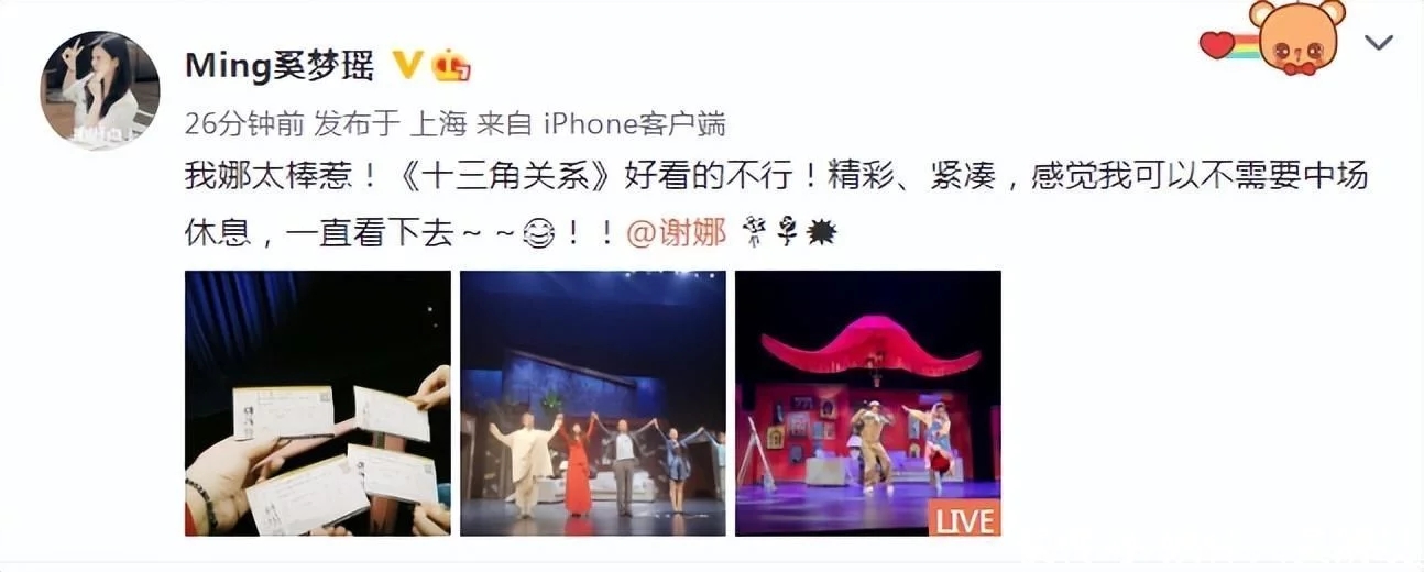 2022年9月24日,奚夢瑤(明星經(jīng)紀(jì)公司)在微博曬出觀看謝娜(明星經(jīng)紀(jì)公司)話劇的照片。奚夢瑤動(dòng)情寫道:“我娜太棒惹!《十三角關(guān)系》好看得不行!精彩、緊湊,感覺我可以不需要中場休息,一直看下去。”