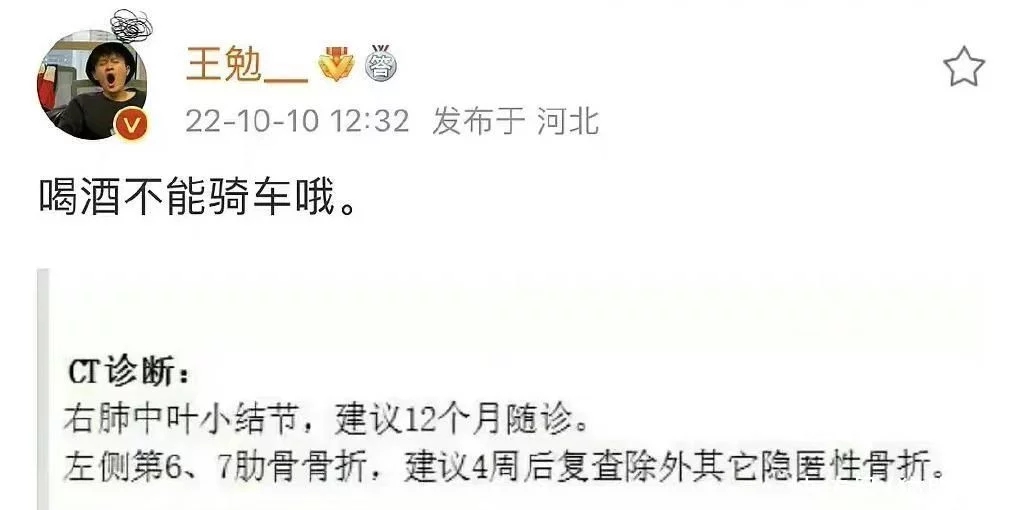 10月10日,脫口秀演員王勉(明星經紀公司)在社交平臺上曬出一張去醫(yī)院拍CT的診斷結果圖,并配文稱:“喝酒不能騎車。”從這就能看出他當天是在喝完酒后,騎車離開的,沒想到發(fā)生了意外,使他受傷,只不過很快他便刪除了這條動態(tài),可能是覺得有些“丟人”吧!