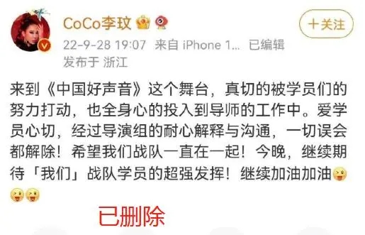 在節(jié)目錄制完的第一時(shí)間,CoCo李玟便將好聲音的相關(guān)博文全部刪除了,這一不對(duì)勁的地方讓不少網(wǎng)友感到詫異,難不成李玟與節(jié)目組發(fā)生沖突了?不然為什么不僅沒有發(fā)出告別好聲音的動(dòng)態(tài),還將此前的博文全部刪除了?