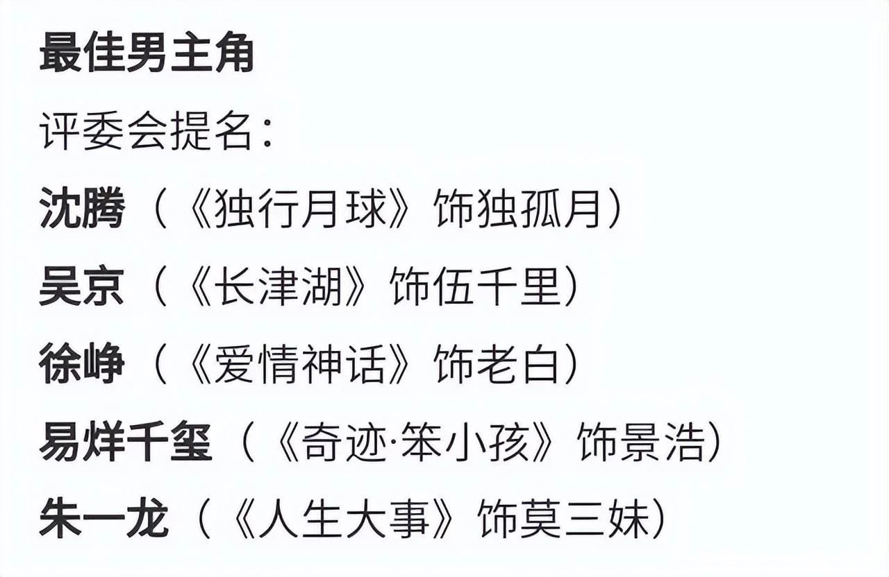 這次金雞獎(jiǎng)提名男演員:《長(zhǎng)津湖》的吳京,《愛情神話》的徐崢,《奇跡笨小孩》的易烊千璽(明星經(jīng)紀(jì)公司),《獨(dú)行月球》的沈騰,最后就是《人生大事》的朱一龍。