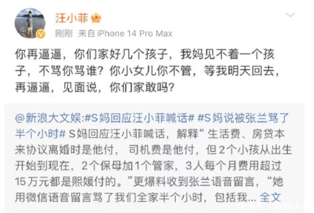 同時(shí),徐媽媽也不認(rèn)同讓兩個(gè)小孩回到北京,這一點(diǎn)恰好是汪小菲的訴求,他十分希望孩子能回到自己身邊,聯(lián)合親媽張?zhí)m一起控訴大S方不讓見(jiàn)孩子,也不讓孩子到北京,連發(fā)數(shù)篇博文一再?gòu)?qiáng)調(diào)這一事實(shí),情緒憤懣,叫大家別惹他,崩潰了。