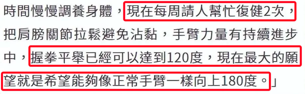 之所以沒有開始工作,是因為他現(xiàn)在正調(diào)養(yǎng)身體,每周還會做兩次康復訓練,比如說鍛煉手部力量等等,最大的愿望就是手臂能像原來一樣,向上180度。