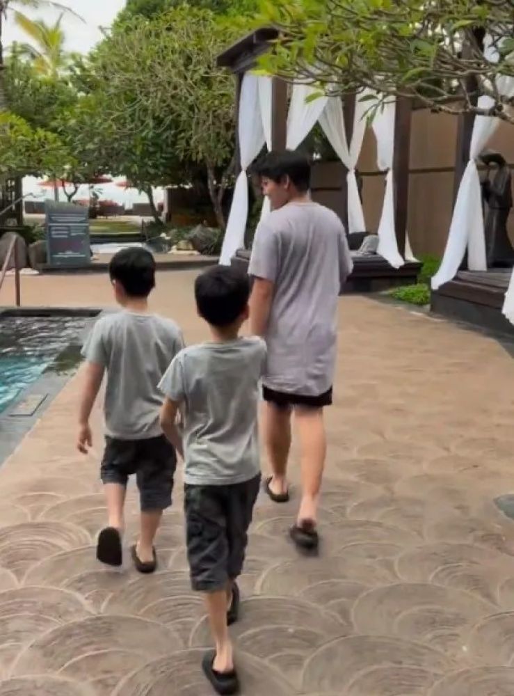 我們可以看到,林志穎的大兒子KIMI長得很健碩,和小時候完全是兩種風格,他的身后還跟著兩個弟弟,三小只蹦蹦跳跳的,十分開心。
