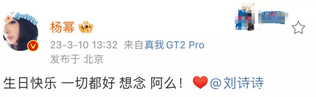 楊冪跟劉詩詩同為85后小花旦,很久沒有見到了,所以這次楊冪除了祝福她一切都好外,也表示自己很想她,在文末發(fā)了一個“阿么”的語氣詞,表達親昵之意。
