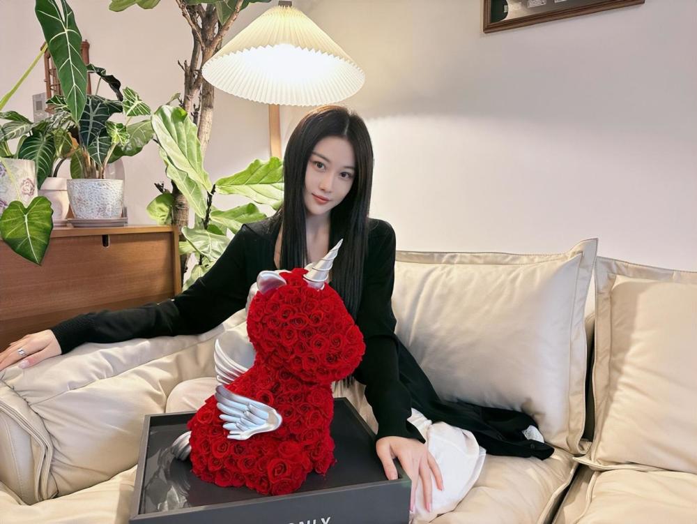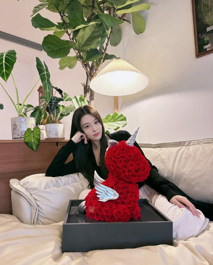 可以看出,其拍攝背景是在她與何捷的廣州家中,張馨予姿勢(shì)慵懶地坐在沙發(fā)上,雙眼含情直視鏡頭,黑長(zhǎng)直造型下得她看上去溫柔嫵媚,而擺在她面前的是一個(gè)獨(dú)角獸造型的花束,由艷麗的紅玫瑰組成,不得不說,這份禮物的確獨(dú)到且用心。