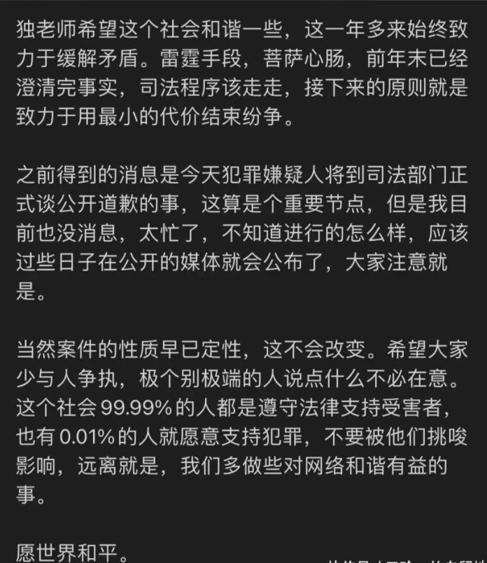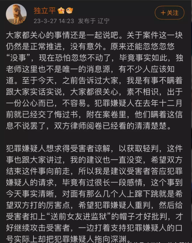 近日,霍尊的經紀人獨立平在社交賬號發(fā)文透露了霍尊與陳露案件的最新情況。