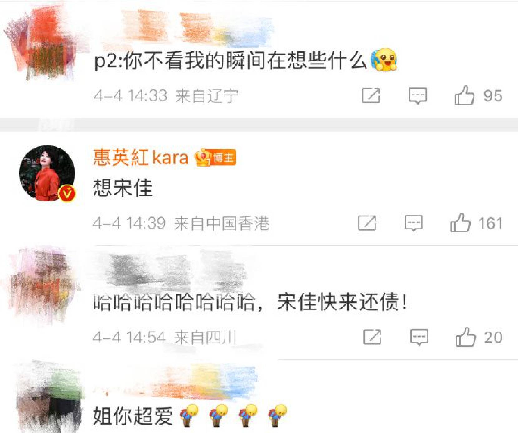 惠英紅(明星經(jīng)紀(jì)公司)在線回復(fù)網(wǎng)友評(píng)論,網(wǎng)友提問(wèn)“圖2你不看我的瞬間在想什么”,惠英紅趣味回復(fù)“想宋佳”,二人關(guān)系親密惹人羨慕。