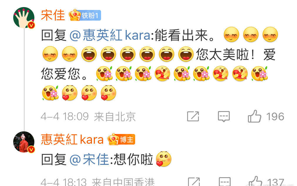 當(dāng)天,惠英紅在評(píng)論區(qū)高調(diào)表白宋佳“我想你了” ,宋佳(明星代言公司)回應(yīng)道:“能看出來(lái),您太美啦!愛(ài)您愛(ài)您。”隨后,宋佳又表示:“我約您能約到嗎?”惠英紅稱(chēng):“你約我能約不到嗎?你少飛一點(diǎn),少親兩口別的美女,就能擠出時(shí)間跟我拍雜志了。”二人互動(dòng)十分逗趣,關(guān)系超親密。