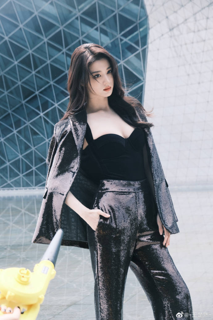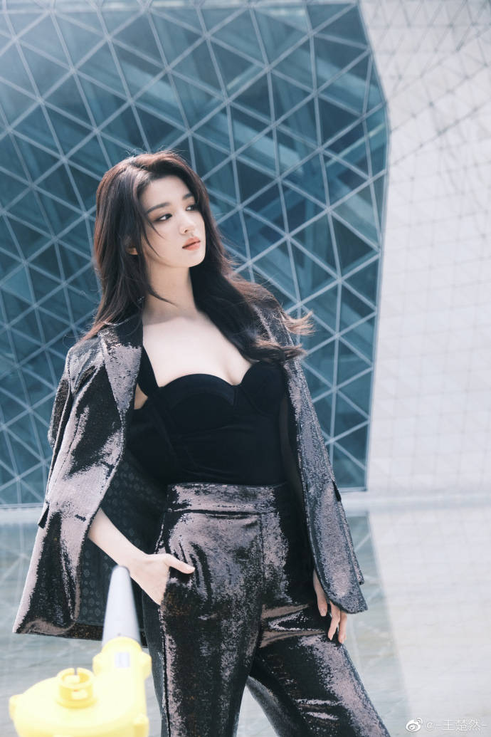 王楚然穿黑色吊帶上衣,披著黑色馬甲,搭配黑皮長褲,俏臉清麗脫俗,秀眸斜視前方,露出自己傲人的乳溝,這位女星單手插兜的樣子,絕對性感冷艷!