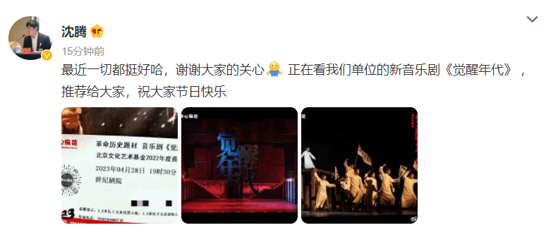 28日,沈騰(明星經(jīng)紀(jì)公司)在社交平臺(tái)上發(fā)文回應(yīng)生病傳聞,稱:“最近一切都挺好哈,謝謝大家的關(guān)心,正在看我們單位的新音樂劇《覺醒年代》 ,推薦給大家,祝大家節(jié)日快樂。”