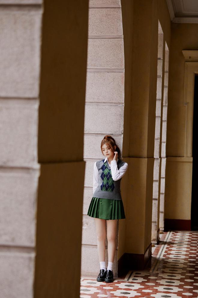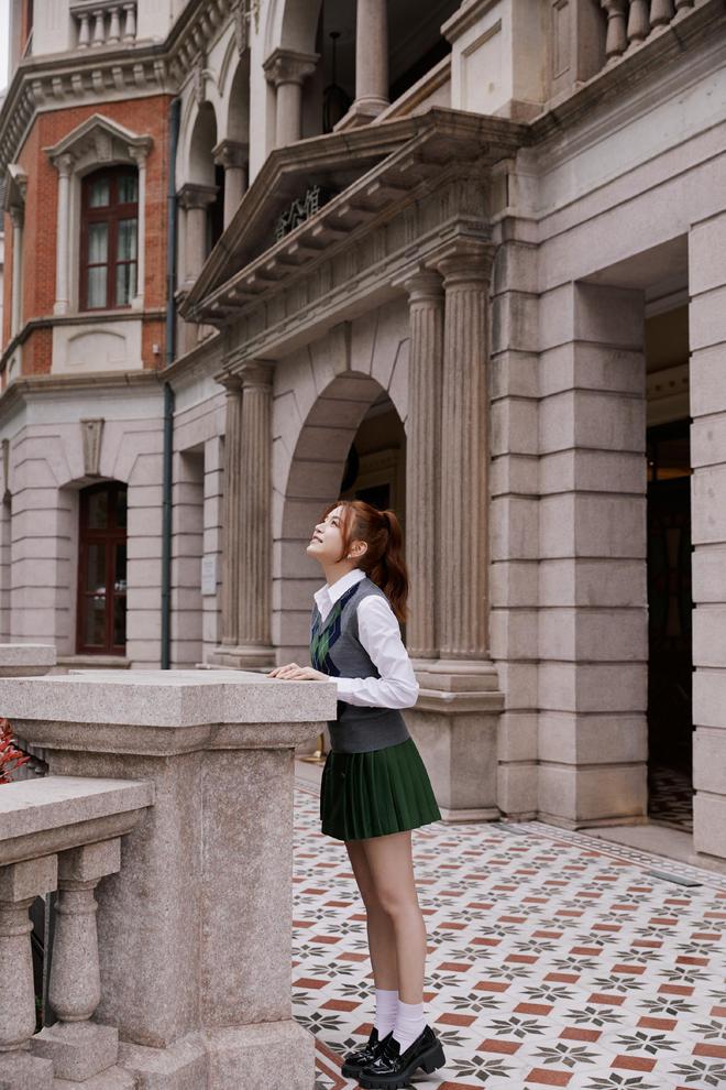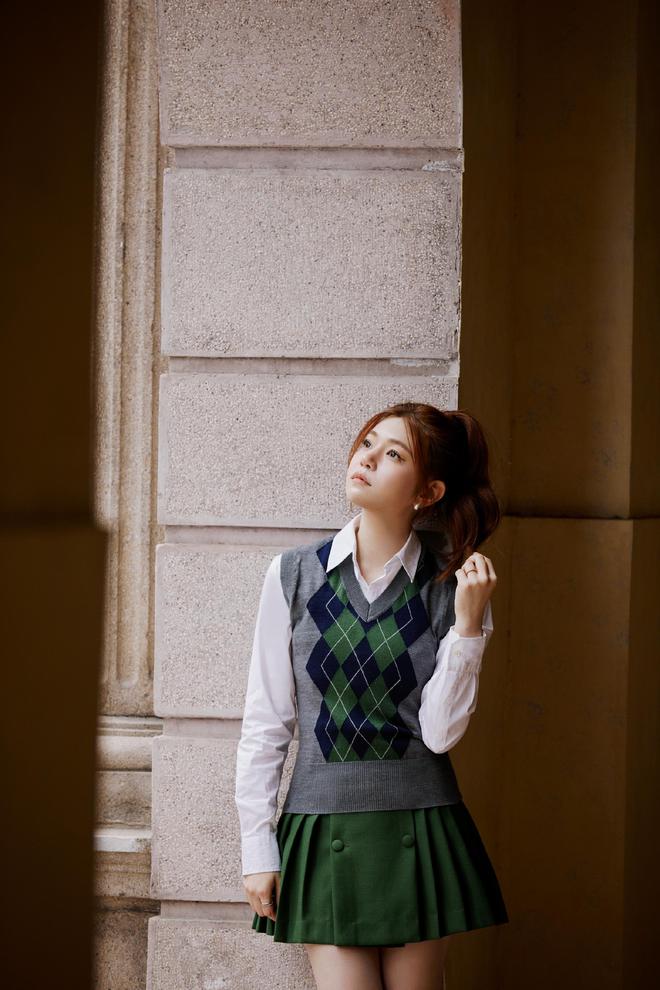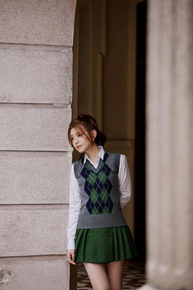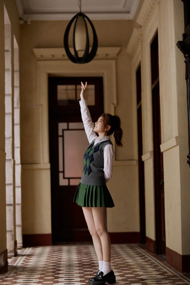 畫(huà)面展現(xiàn)了一個(gè)由白色襯衫、格紋毛衣背心和墨綠色百褶短裙組成的協(xié)調(diào)宜人的穿搭。高扎馬尾更是配合學(xué)院氣息,流露出姑娘初長(zhǎng)成時(shí)的青澀俏麗感。整個(gè)造型清新自然,溫柔學(xué)姐的氣質(zhì)淋漓盡致。