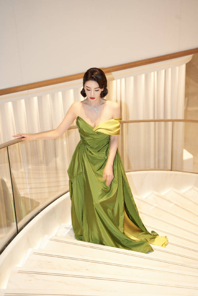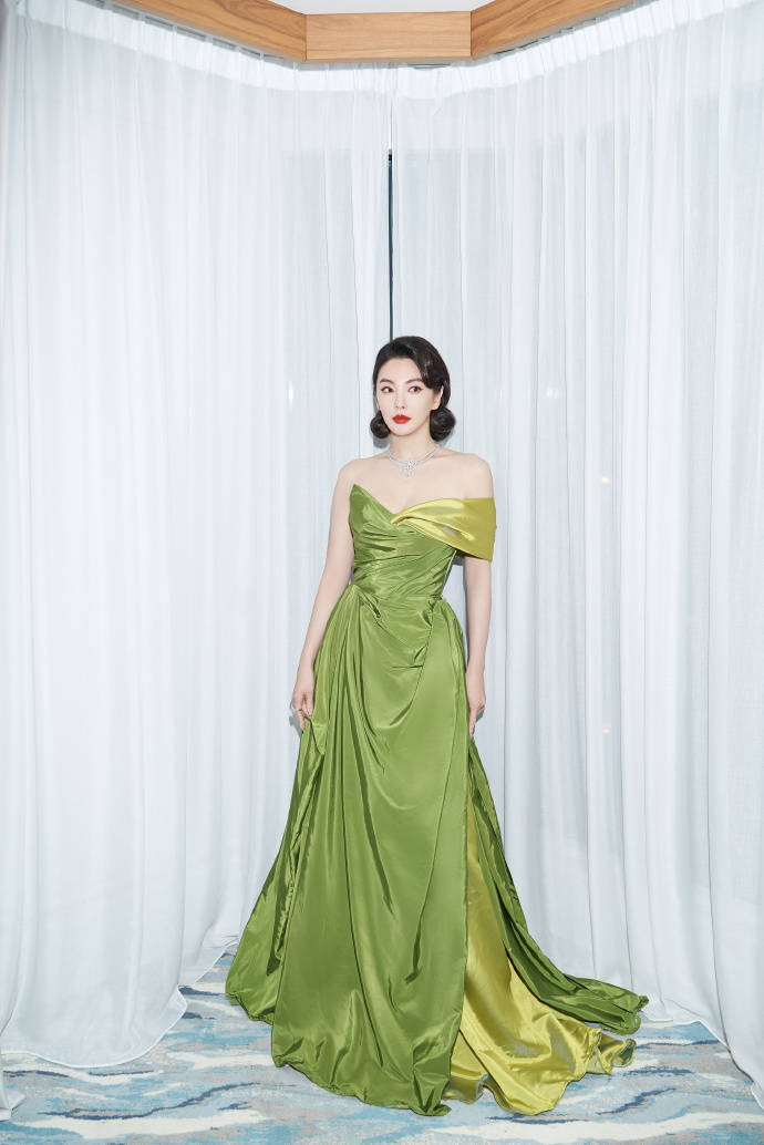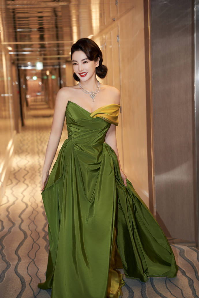 張雨綺身穿綠色抹胸裙,她俏臉成熟嫵媚,明眸善睞,唇紅齒白,烏黑的秀發(fā)梳在腦后,露出白皙的香肩和傲人的事業(yè)線,這位女星喜笑顏開,魔鬼身材盡顯無遺,絕對(duì)性感火辣!