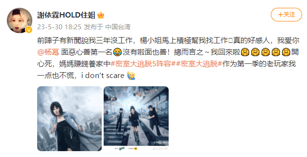 5月30日,謝依霖(明星代言公司)在社交平臺上發(fā)文稱自己時隔多年重新回歸《密室大逃脫5》,“作為第一季的老玩家,我一點也不慌,i don't scare”。她透露道:“前陣子有新聞?wù)f我三年沒工作,楊小姐馬上積極幫我找工作。真的好感人,我愛你@楊冪 ”,謝依霖還調(diào)侃楊冪是面惡心善第一名,之后馬上改口稱“沒有啦面也善!總而言之~我回來啦,開心死,媽媽賺錢養(yǎng)家中。