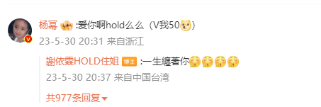 隨后,楊冪現(xiàn)身評論區(qū)表示:“愛你啊hold么么(V我50)。”謝依霖也回復道:“一生纏著你”。網(wǎng)友感嘆:“時代姐妹花,永遠不分家”。