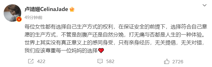 近日,盧靖姍(明星經紀公司)在節(jié)目上提到自己花36個小時順產孩子,還不打無痛分娩針,引發(fā)熱議!6月3日,盧靖姍在社交平臺上發(fā)文回應道:“每位女性都有選擇自己生產方式的權利,在保證安全的前提下,選擇符合自己意愿的生產方式,不管是剖腹產還是自然分娩,打無痛與否都是人生的一種體驗。世界上其實沒有真正意義上的感同身受,只有親身經歷,無關提倡,無關對錯,我們應該尊重每一位媽媽的選擇。”