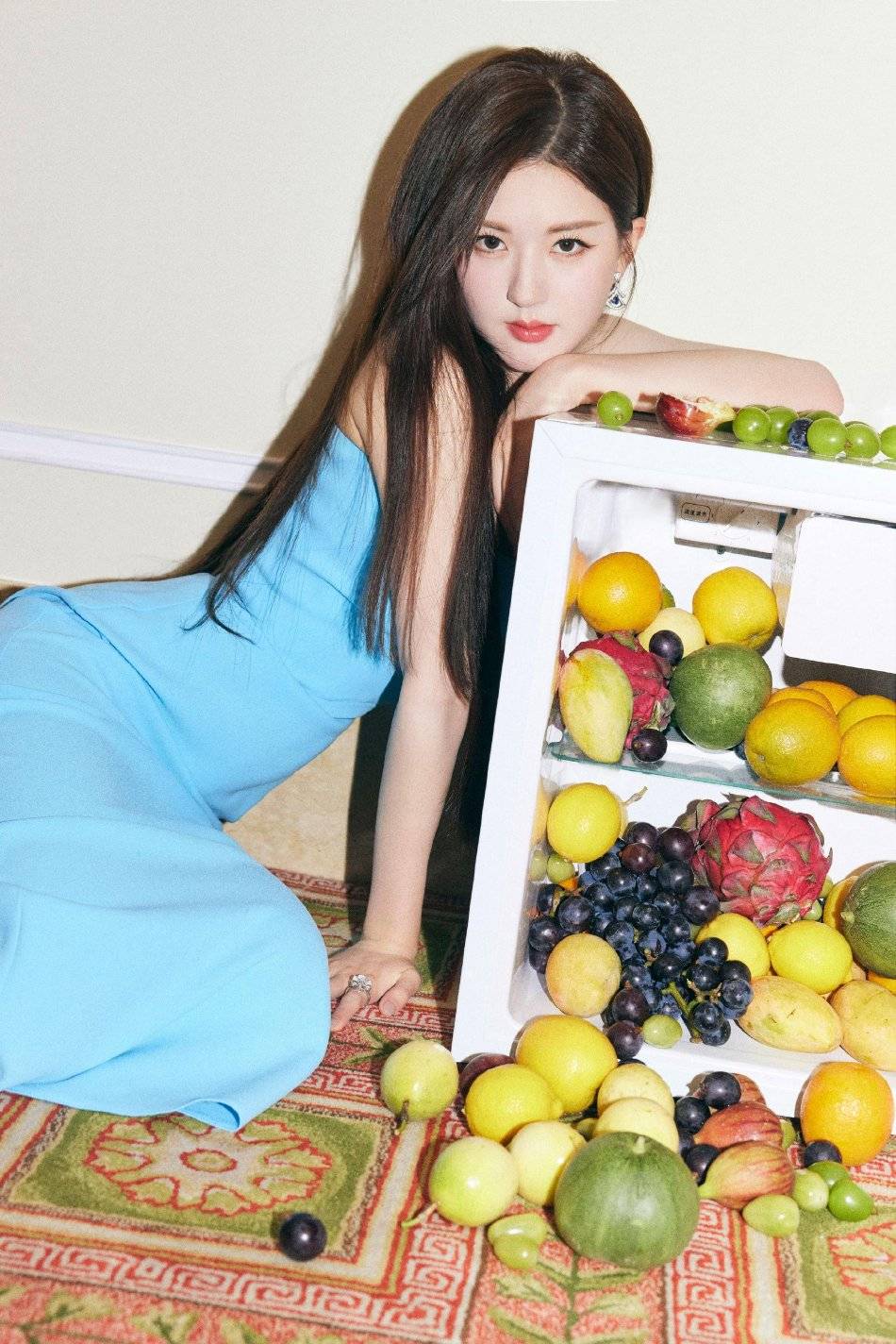 趙露思坐在果柜邊上,單手扶著柜子頂部,露出嫵媚的表情,絕對(duì)風(fēng)情萬種!