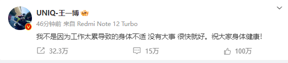 王一博發(fā)文報平安:不是因為工作太累導致身體不適