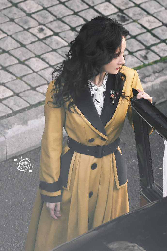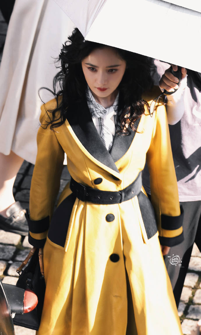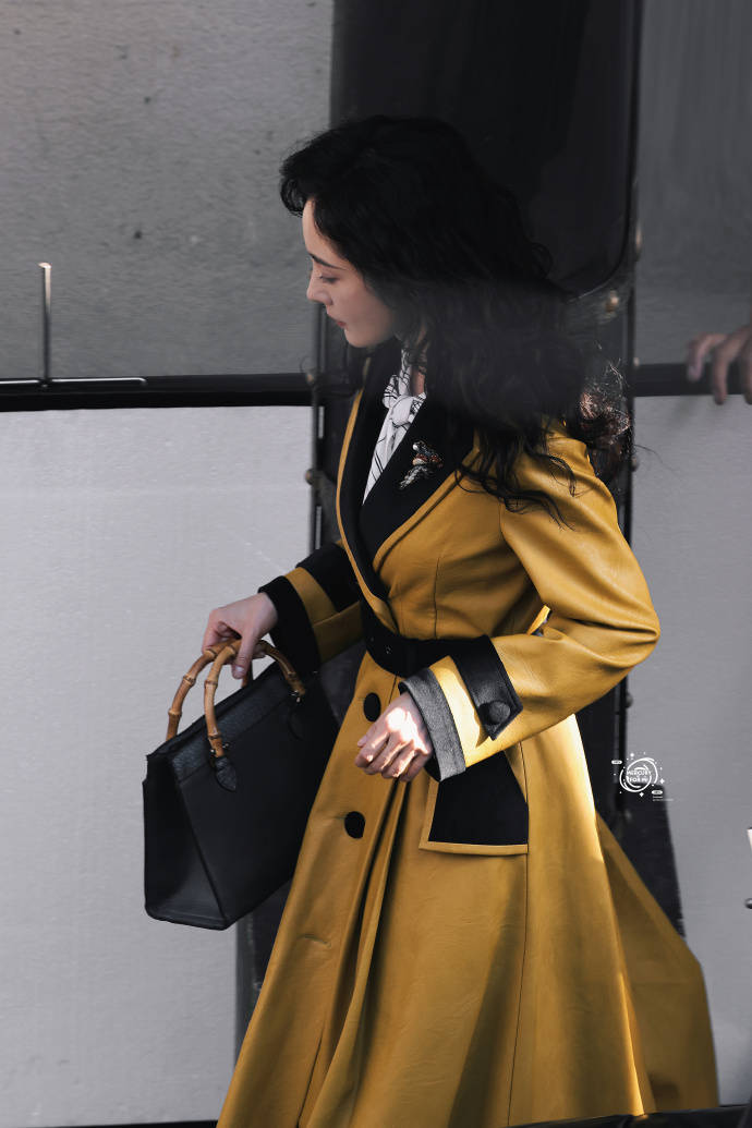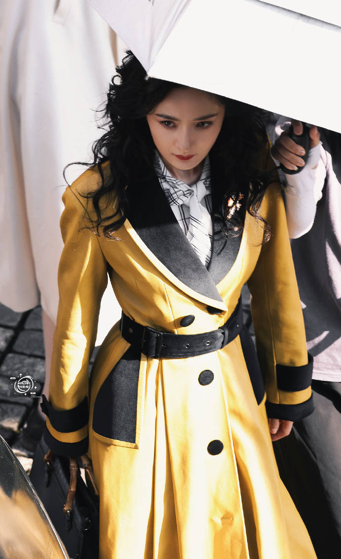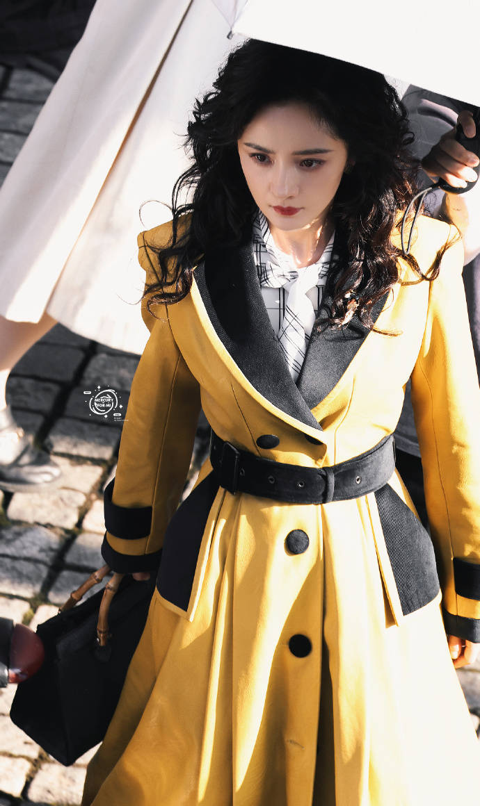 楊冪穿黃色大衣腰肢纖細 卷發(fā)紅唇造型復古優(yōu)雅
