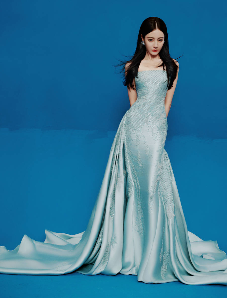迪麗熱巴仿佛人魚公主探出水面,一襲藍色禮裙仿佛翻滾的海浪。