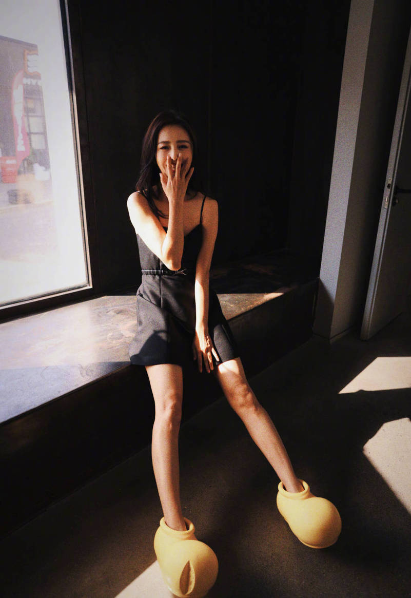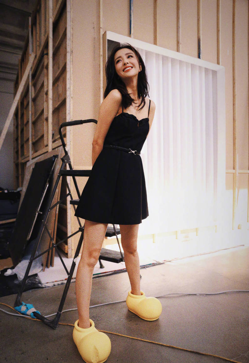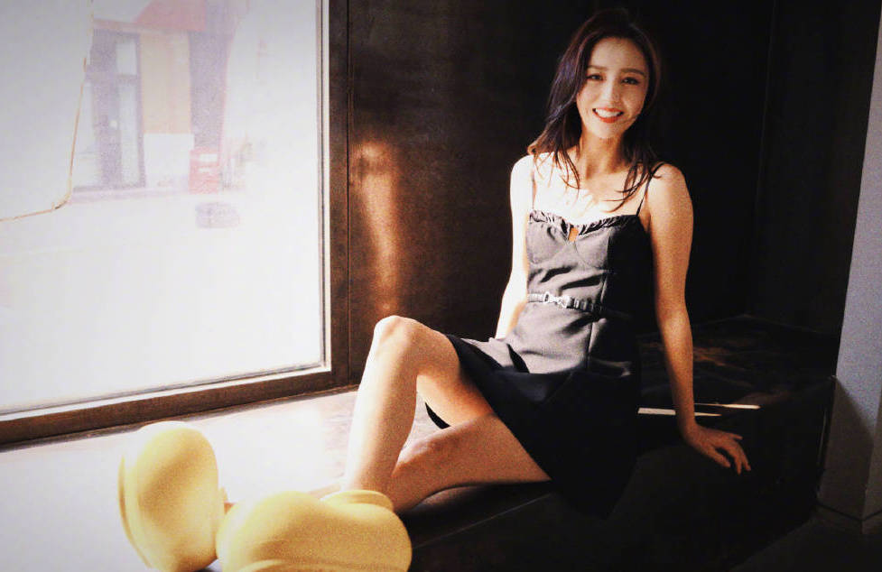 佟麗婭穿黑色吊帶裙純欲性感 腳踩小黃鞋童趣可愛(ài)