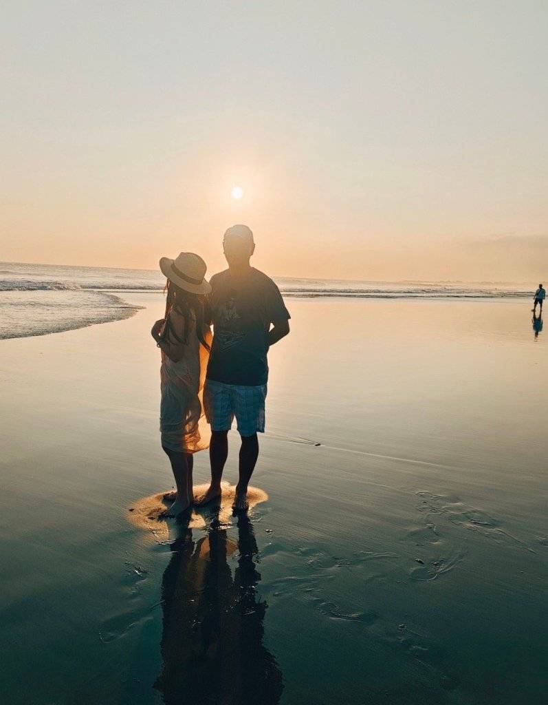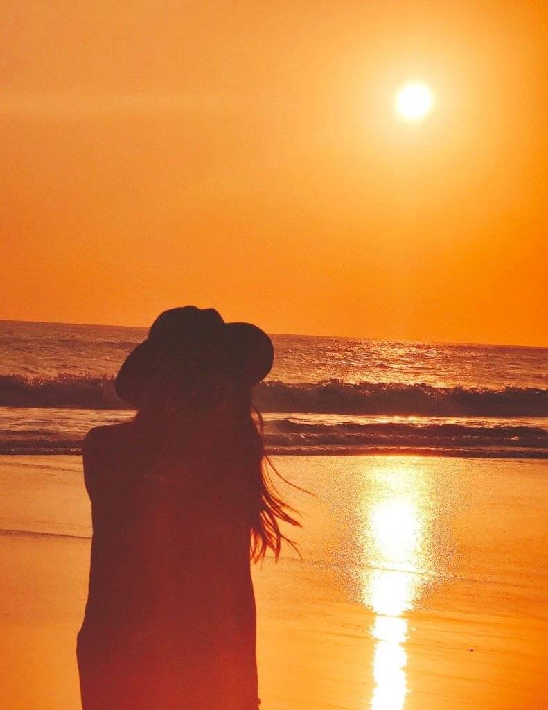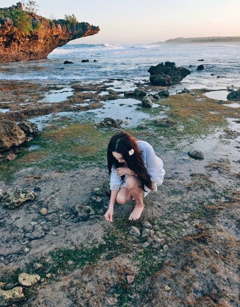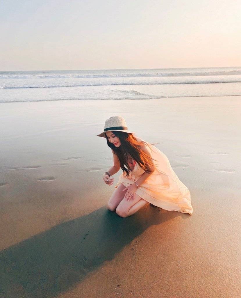 溫碧霞赤腳在海邊享受生活。