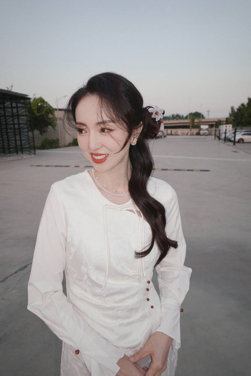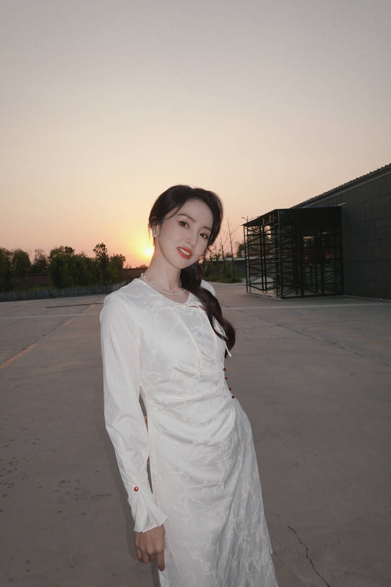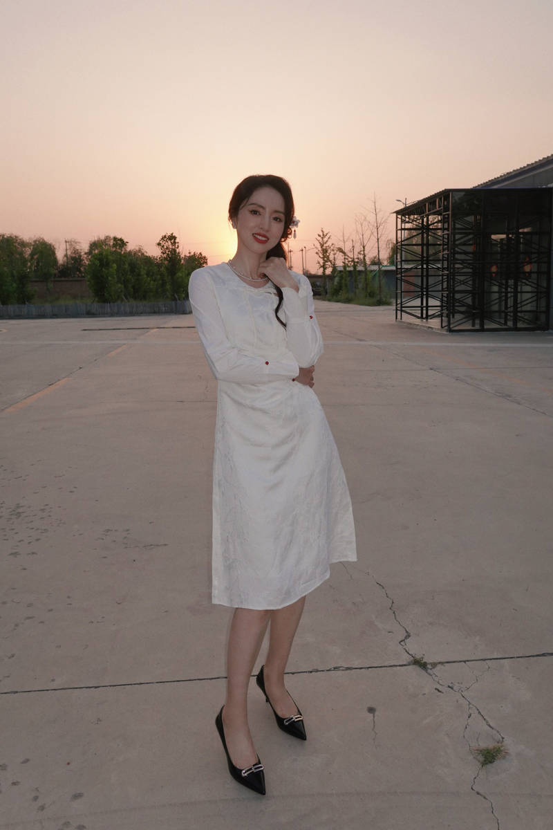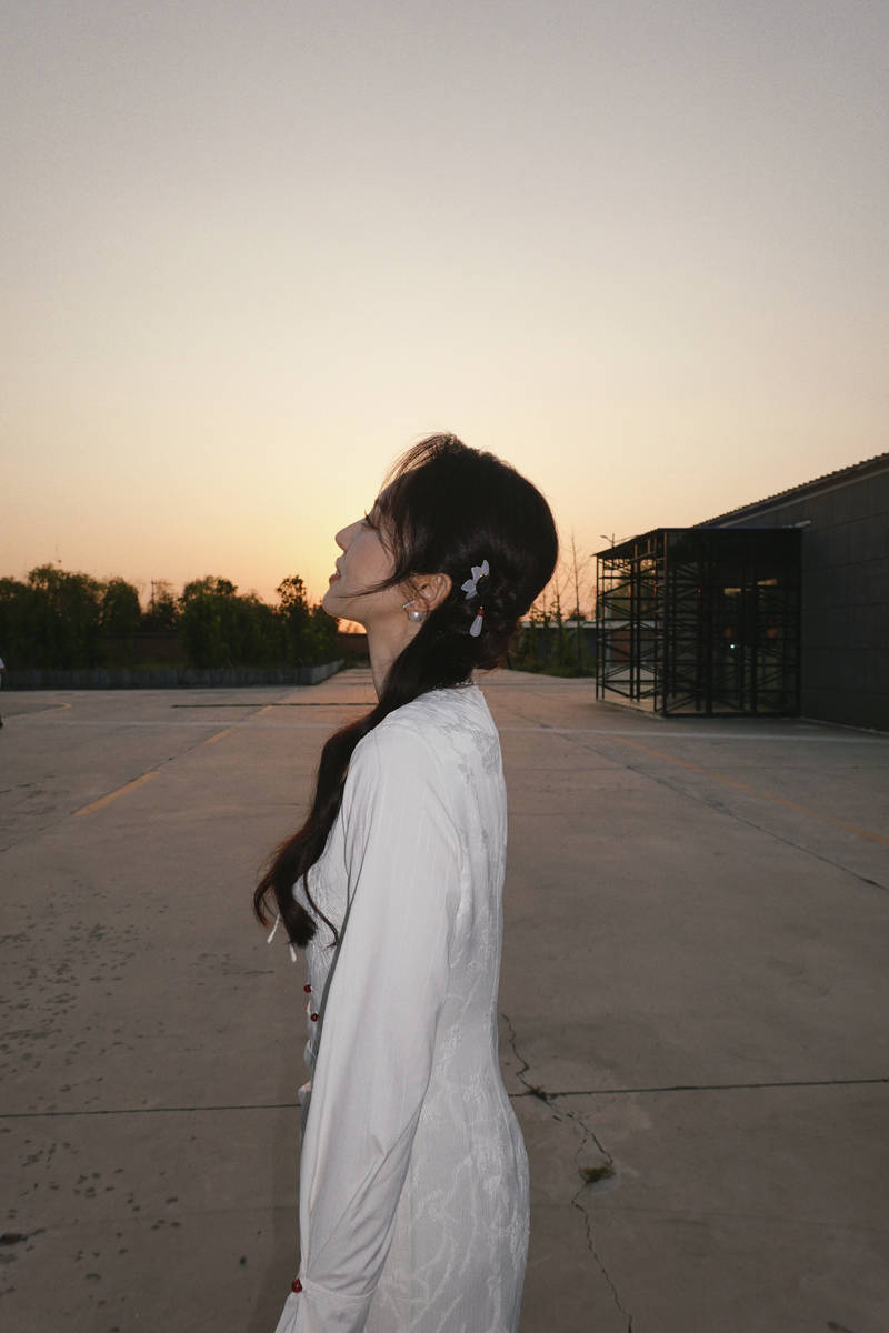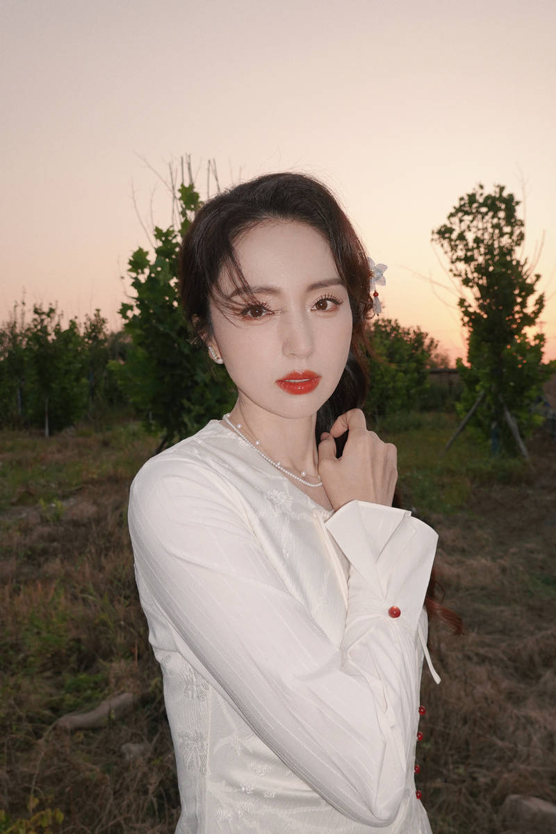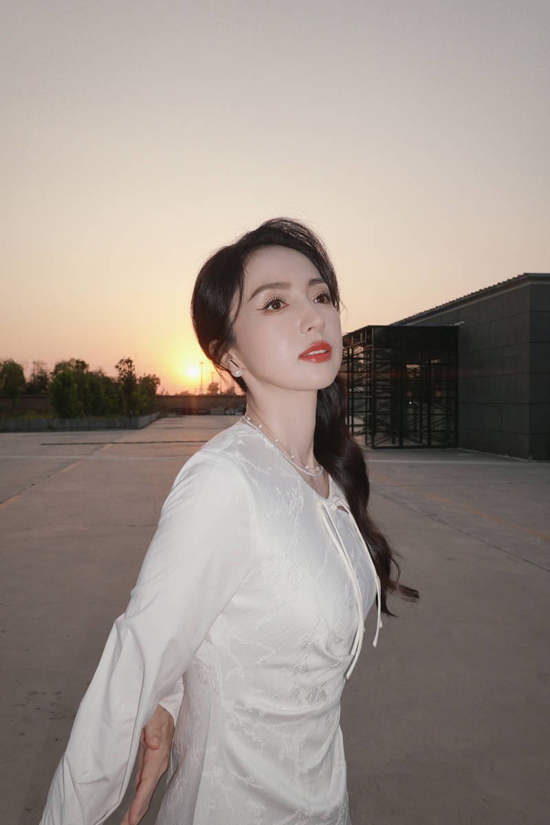 董璇一身白裙立于落日下 頭上簪花中式韻味十足