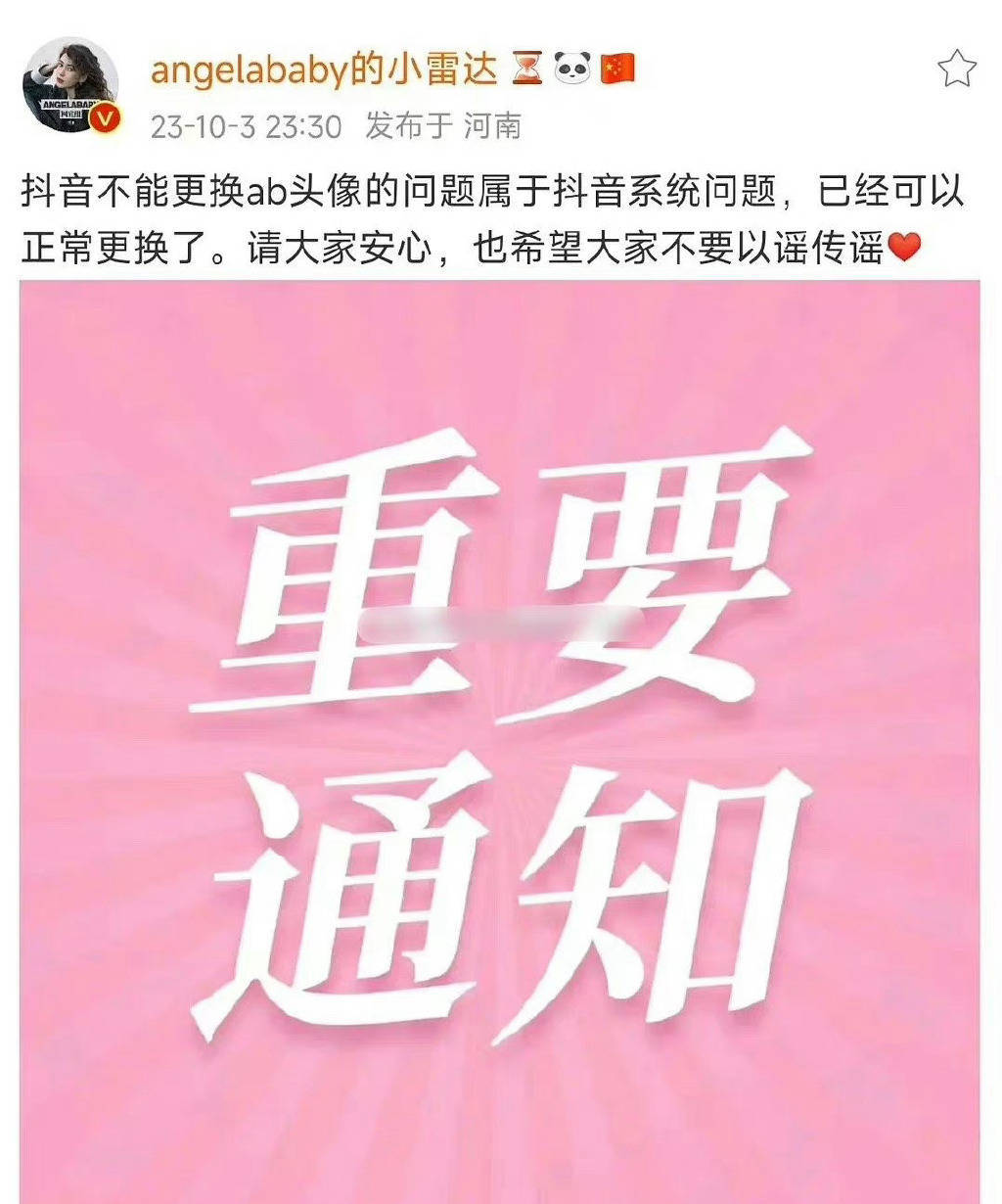Angelababy方回應(yīng)被封殺傳聞:頭像無(wú)法更換是系統(tǒng)問題已修正