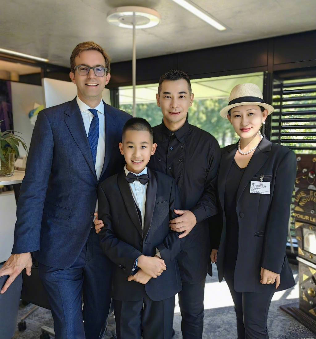 趙文卓和老婆張丹露與兒子的合影,一家人身穿西裝,神清氣爽。