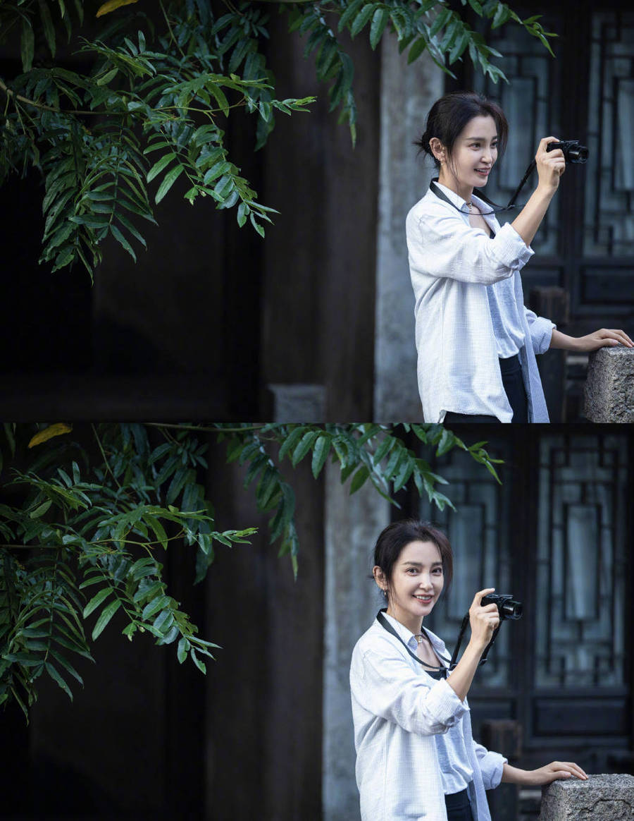 李冰冰眉眼溫柔,舉相機(jī)記錄美景。