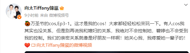 10月31日,向太陳嵐曬出自己的萬圣節(jié)cos造型,并再次回應(yīng)自己被模仿一事,她否認(rèn)會(huì)控制郭碧婷,表示兩人是好朋友一樣的關(guān)系,會(huì)互相疼愛關(guān)心,“有人cos我其實(shí)也沒關(guān)系,但是別再說我和媳婦的關(guān)系,我絕對(duì)不會(huì)控制她,碧婷也不會(huì)受到我的控制。我們的親密關(guān)系就像是好朋友一樣?。∷P(guān)心我,我疼愛她一輩子的!”